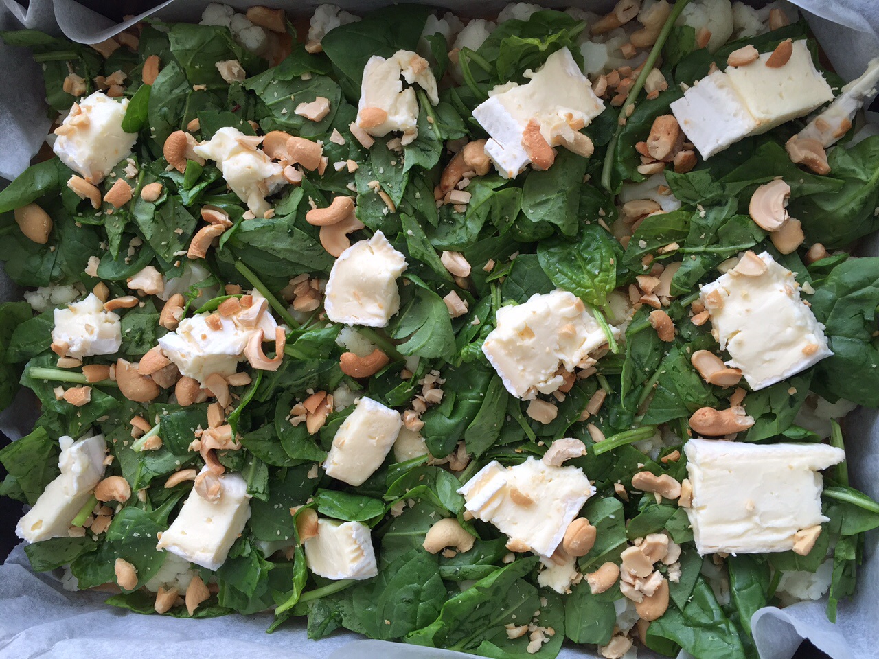 - snijd de spinazie wat fijn en verdeel over de schotel