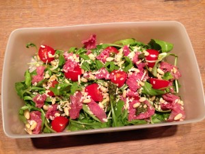 Rucola rookvlees salade rucola sla snoeptomaatjes 50 gram lichtgezouten runderrookvlees pijnboompitten klein beetje geraspte oude kaas verse pesto olijfolie balsamicoazijn Erg handig om ’s morgens klaar te maken en mee te nemen naar kantoor.